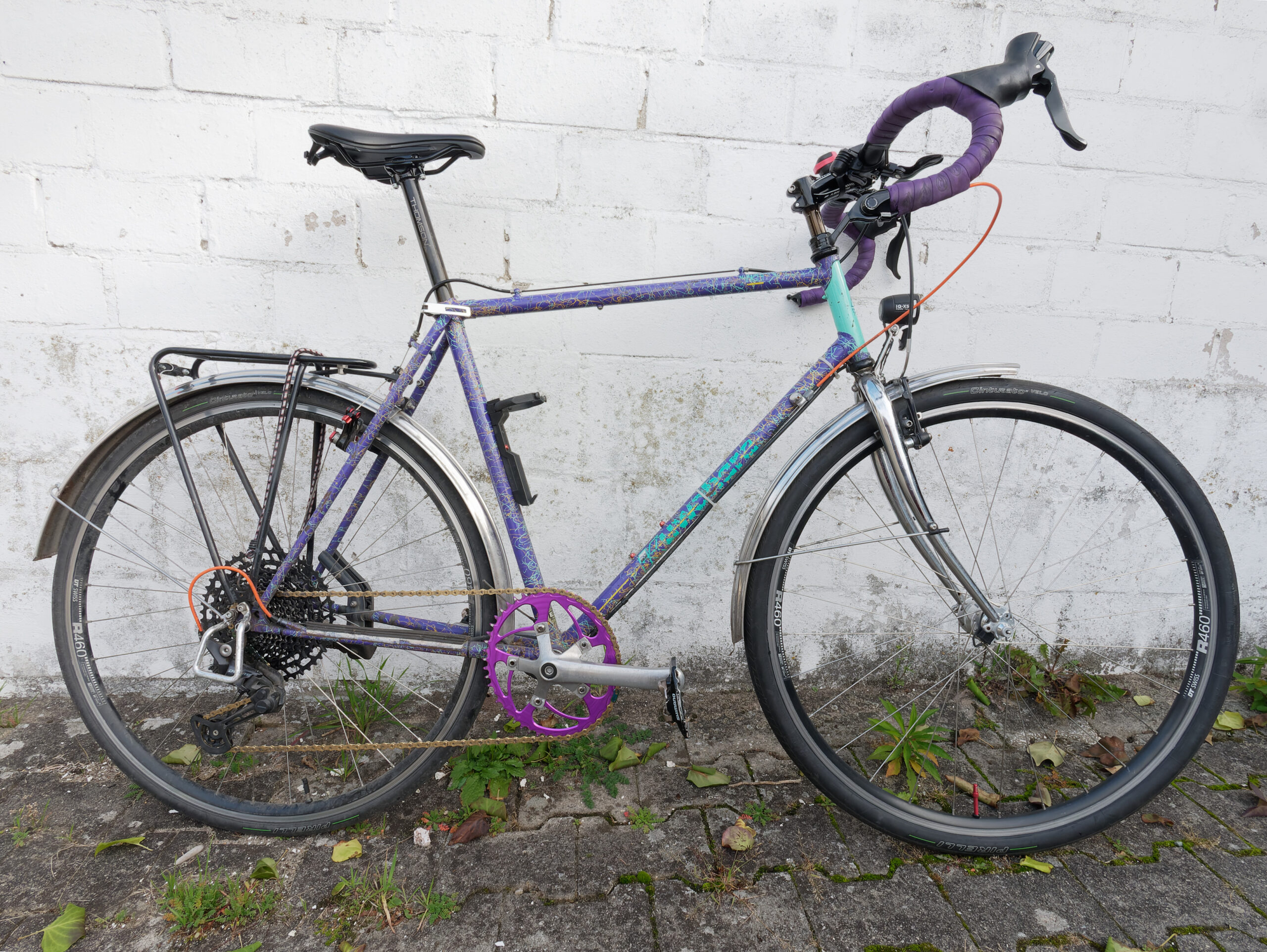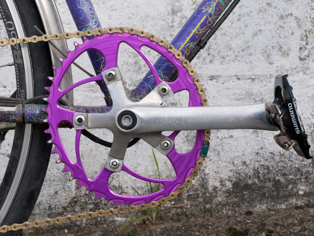 Ich habe (doppeldeutig) an dieser Stelle schon mal „ABSOLUT finaler Aufbau“ getitelt. Tja, nun kommt das diesbezügliche Korrektiv. Der X-Pacer hat zumindest ein bisschen weitere Modifikation erfahren. Die auffälligste davon: Ich habe das Kettenblatt mit dem des Hi-Pacers getauscht. Also nun ist hier das violette 50er Kettenblatt von Alugear verbaut. Das ursprüngliche, ansonsten identische (also ebenfalls oval und Narrow-Wide), aber schwarze 44er ist im Hi-Pacer besser aufgehoben, weil die Fahrpraxis für den dort verbauten 16 Zähne-Freilauf hinten ein kleineres Blatt vorne verlangt hat…
